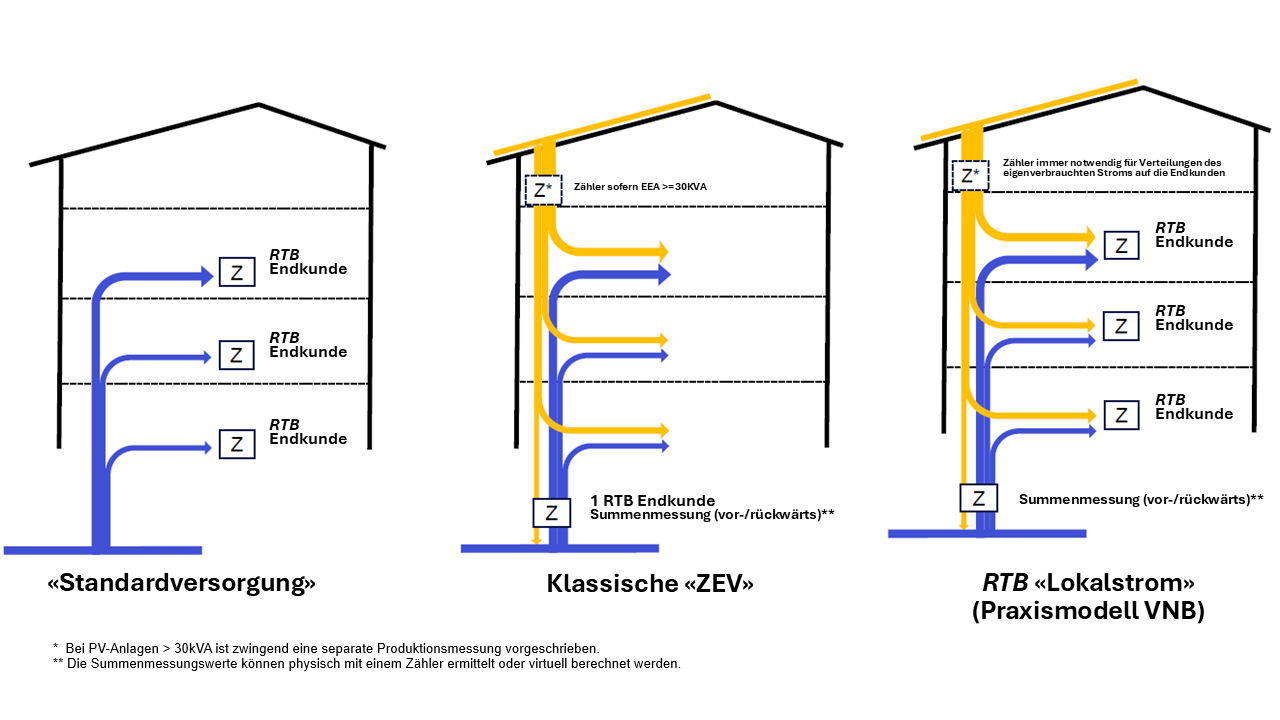 In den Modellen «ZEV» und «RTB Lokalstrom» gilt es die Verantwortlichkeiten und Zuständigkeiten zu beachten: Im klassischen ZEV-Modell rechnen die RTB mit dem Grundeigentümer lediglich den Bezug aus dem Netz ab und vergüten die ins Netz zurückgespeiste Energie. In der Zuständigkeit des Grundeigentümers resp. ZEV-Verantwortlichen liegen folgende Aufgaben: